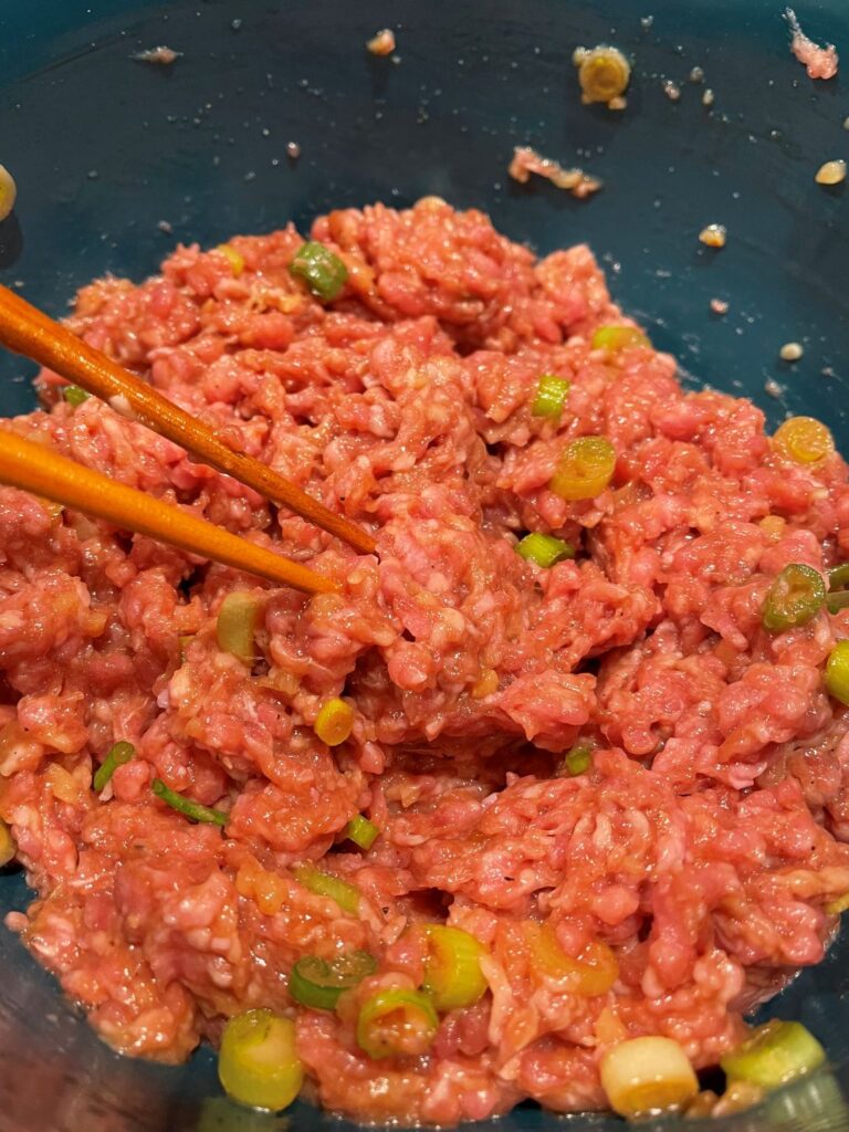 - In a large bowl, combine pork, egg, green onions, soy sauce, oyster sauce, rice wine vinegar, honey, garlic, ginger, salt, and pepper. Mix thoroughly to combine.