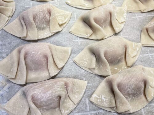 The easiest shape to make is the basic half moon where you simply fold the dumpling wrapper in half over the filling. If you want to make more decorative shapes, check out the numerous dumpling folding tutorials online. For this recipe, I do a fan shape with 4 pleats. Regardless of how you fold them, they will be delicious!