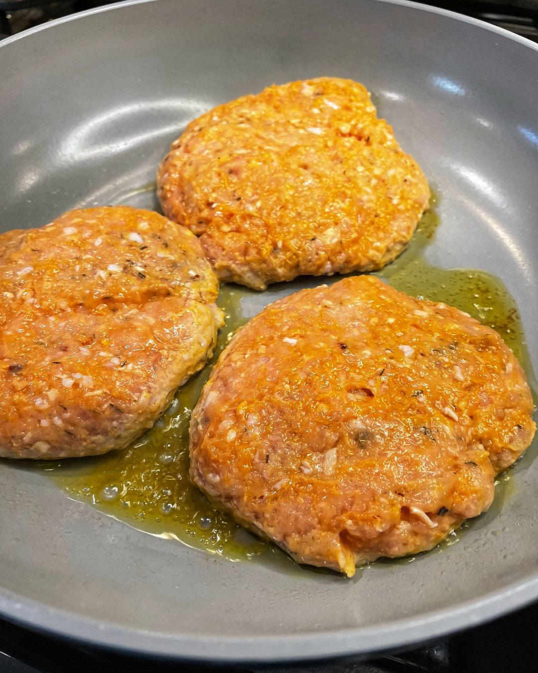 Heat a large non-stick skillet on medium heat. Add a drizzle of olive oil. Then add the burger patties. Cook burgers until browned, about 3-4 minutes. Carefully flip and brown the other side for another 3-4 minutes until cooked through (165°F).