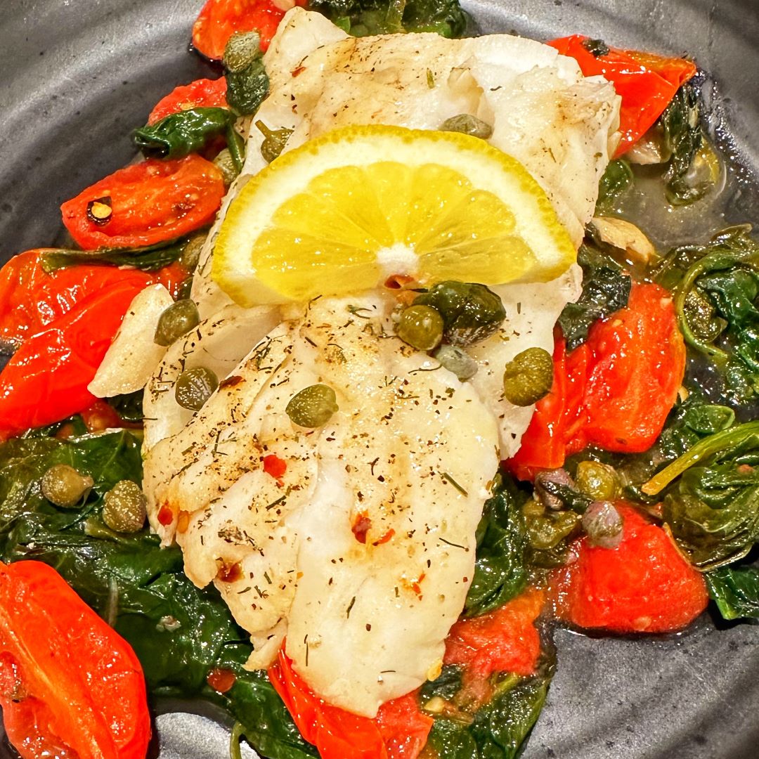 - Add the cod and season with salt, pepper, dill, and red pepper flakes. Sauté for an additional 1-2 minutes until the greens start to wilt and the tomatoes start to soften.