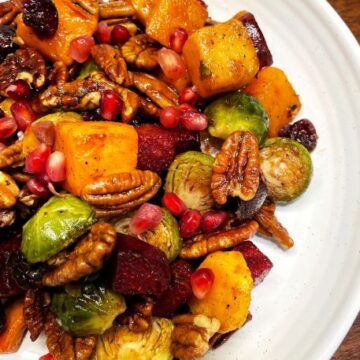 I am really excited about this dish! I saw several roasted vegetable recipes for the holidays and decided to create my own version. It does not disappoint! Vibrant colors, bright, fresh flavors, and tons of healthy vegetables and nuts make you feel so good eating this!