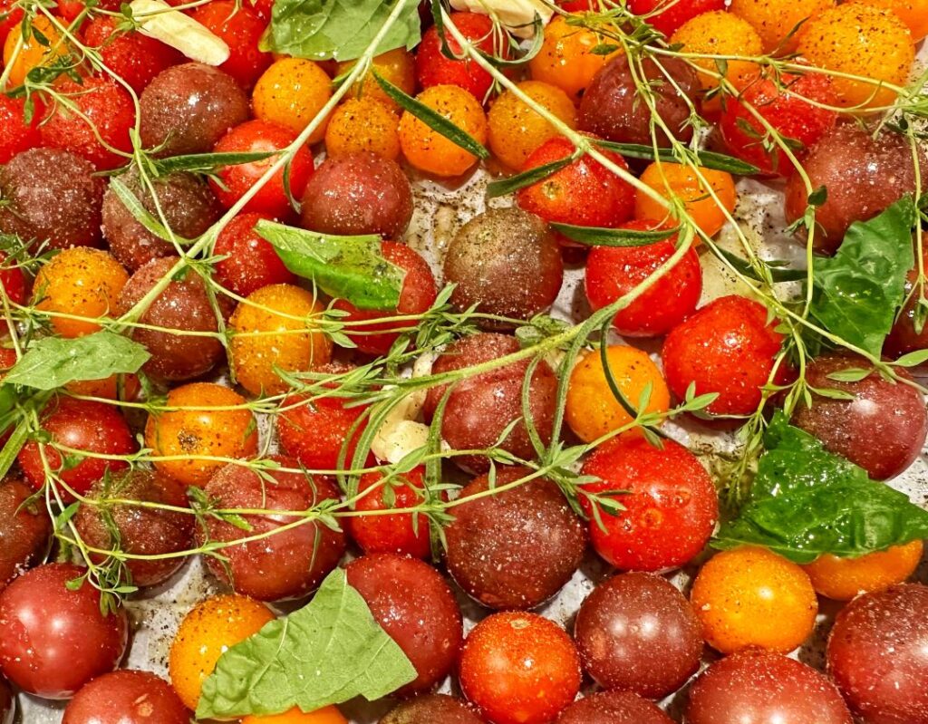 - Rinse the tomatoes, drain, and place directly onto the baking sheet. Spread them in a single layer.