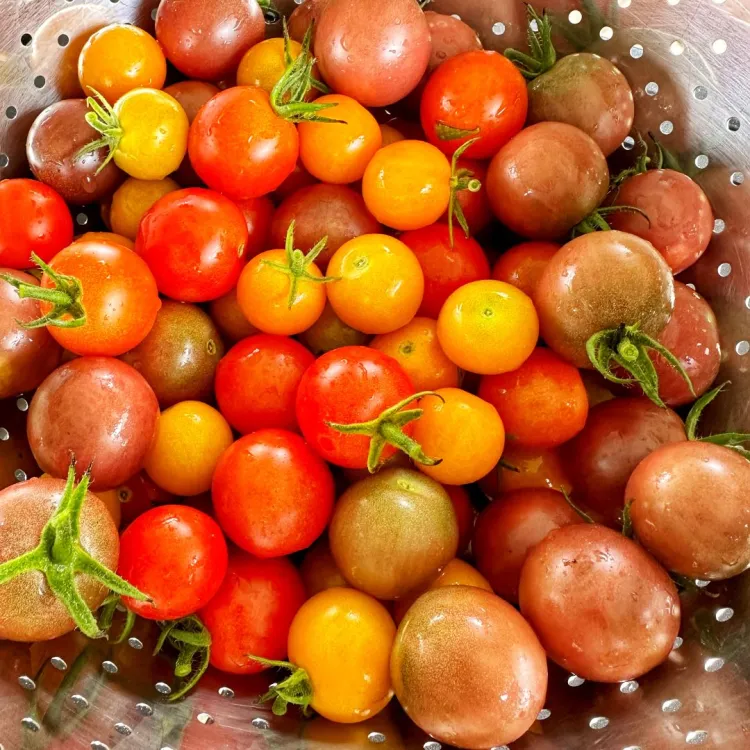 When I have a huge abundance of cherry tomatoes, I will roast sheet pans full, then cool and freeze them to enjoy all year round. They are great to add into chili and soup or to pureé for sauce.