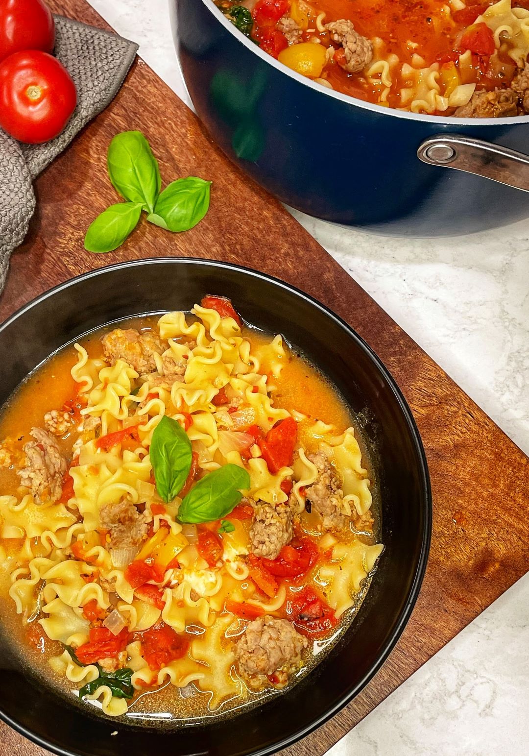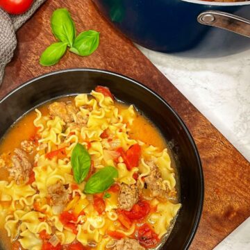 Everything you love about lasagna in an easy-to-make soup! Cheesy, tomatoey, and lots of noodles!
